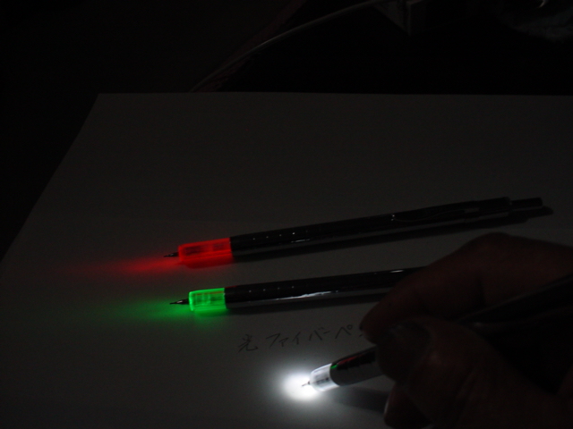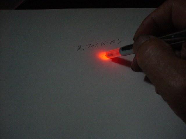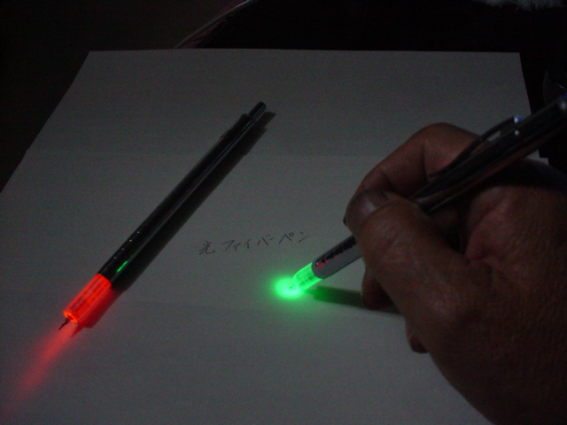 時代に求められるペン・・「光ファイバーペン」 老若男女、初めて見た方々の真実、感嘆の声! 「すごい、初めて見た!」 「スッゲー!」 「シャレたペンですねー」 「いいものが出来たんですねー」 「すばらしい!」 「ハイテクですねー」 「ほしーい!」 「さすが21世紀」 「どこに売ってますか」 「アラッ!このペンすごい!」 「ビックリした。このペン、ノックしたら光ったー」 「・・・・・・・・・・・・・・・・押し黙り」 「いいものを見せてもらった」 「すてきー」 「初めて見ました。こんな物があるんですか・・・」 「コリャーいい!年寄りに助かるペンだわ」等など・・・・・・・・。 絶賛のコエ、こえ、声です。 通常、ボールペンでこれほどの声を聞くことは有りません。 「光ファイバーペン」 最新タイプ ポリススペシャル 6000mmcd 白色LED使用 National BR435電池使用 替え芯付き 取り説付き メーカー完全保障付き ペン本体価格 2000円 交換用電池芯セット 500円 連絡先メール ebisko@nifty.com 担当 東 ヤフーオクション販売 ヤフーオークション 動画で使用方法のチェック http://ebisko.cocolog-nifty.com/ へ 特許(中国特許、実案取得済み) 片手ノックだけで芯露出とスイッチON.OFFできるのが嬉しい本格実用ライトペンです。 筆記面だけを照らし、周囲に光の影響を与えないので迷惑をかけず、 21世紀は24時間フルタイム活動の時代です。 光ファイバー原理を応用! 透明アクリル樹脂棒に入射角度を付けてLEDの光を通すと この集束照射光が世界の紙幣真贋の判別にも使えます。 海外で手軽にプロ並みの紙幣判別ができる超優れ物のペンです。 紙幣判別に関しては |